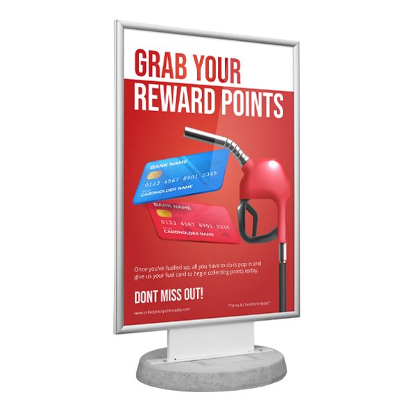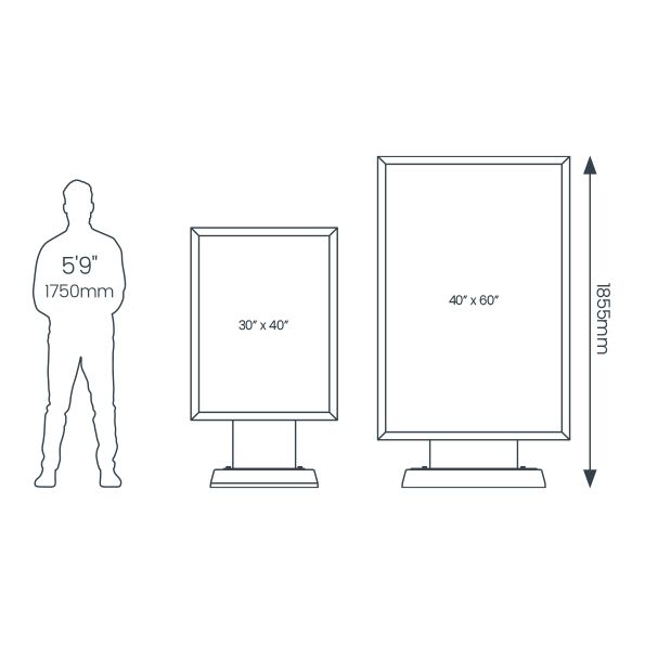 | Poster Size | Display Area (w x h mm) | O/A Dimensions (w x h mm) | Base Diameter (mm) | Weight (kg) Base | Weight (kg) Frame | Order Code |