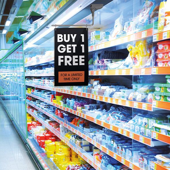 - Perfect for double-sided projecting shelf messaging in supermarket and shopping aisles.